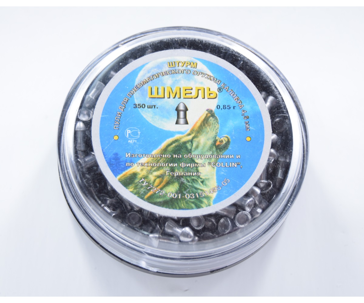 Пули Шмель «Штурм» калибра 4,5 мм — штампованные свинцовые пули с полусферической головной частью. Тяжелые свинцовые пули для охоты из мощной пневматики. Обладают отличными баллистическими характеристиками. В упаковке 350 штук, средний вес 0,85 грамм.