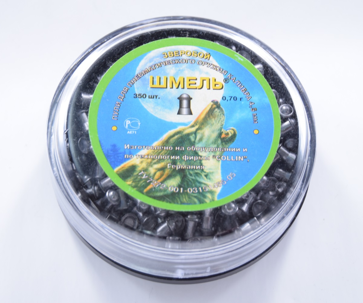 Пули Шмель «Зверобой» калибра 4,5 мм — штампованные свинцовые пули с полусферической головной частью. Тяжелые свинцовые пули для охоты из мощной пневматики. Обладают отличными баллистическими характеристиками. В упаковке 350 штук, средний вес 0,7 грамм.
