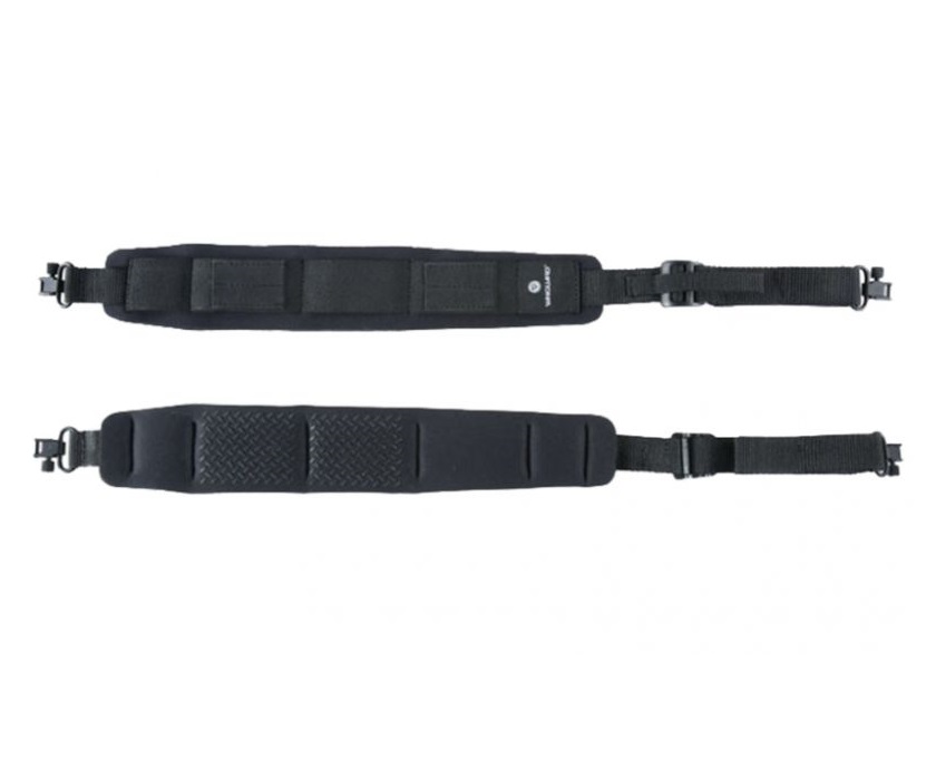 Мягкая накладка из неопрена и резиновая вставка на внутренней стороне ремня позволяют использовать ремень с любым типом огнестрельного оружия. Ремень полностью амортизирует удары во время ходьбы и равномерно распределяют вес, уменьшая нагрузку на плечо. Это позволяет снизить усталость при длительной носке оружия. Оснащен петлей для пальца и поворотными антабками из металла.