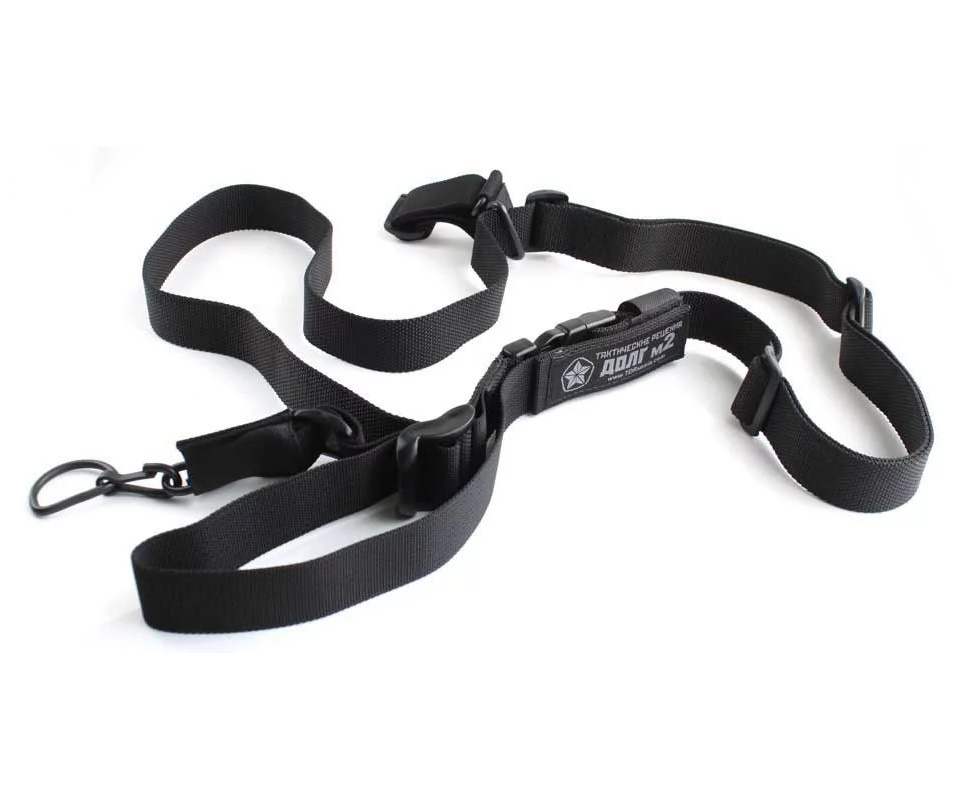 Профессиональный 1-2-3-точечный тактический оружейный ремень DOLG-M2. «Универсальная комплектация» — карабин не пришит к ленте подтяга, а привязан с помощью двущелевой пряжки.