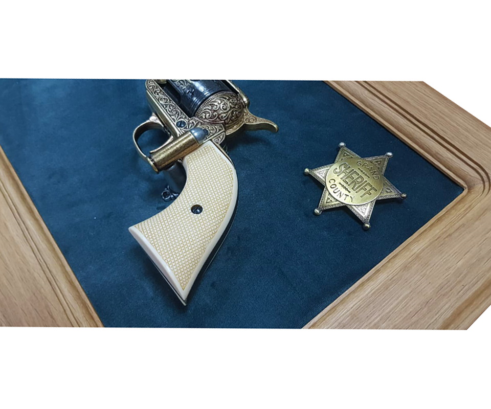 Револьвер кавалерийский системы Кольт, 7½», калибра .45, США 1873 г. (DE-B-1281-L) на бархатном панно. Интерьерная композиция, внутренний размер 43 х 23 см, зеленый бархат, материал дуб, цвет натуральный