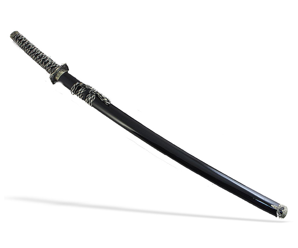 Японская Катана с классическими черными ножнами и цубой с изображением дракона. Великолепный подарок любителям японской культуры и интерьера в японском стиле. Настольная подставка в комплекте.