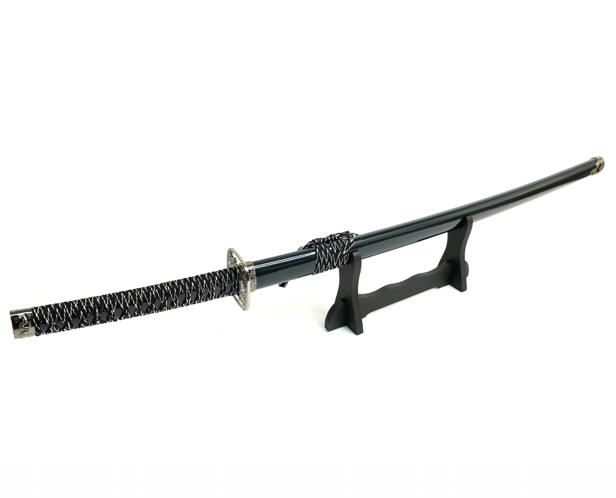 Эффектный меч Катана с рукоятью прошитой светлыми нитками и с синими ножнами. Это станет ярким подарком поклонникам японской культуры и дизайна в японском стиле. Настольная подставка в комплекте.