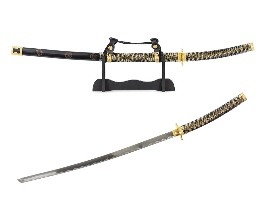 Японский меч Тати с ножнами черного цвета и золотой цубой с гравировками в японских мотивах (драконы и воины). Рукоять меча выполнена в золотой отделке. Настольная подставка в комплекте.