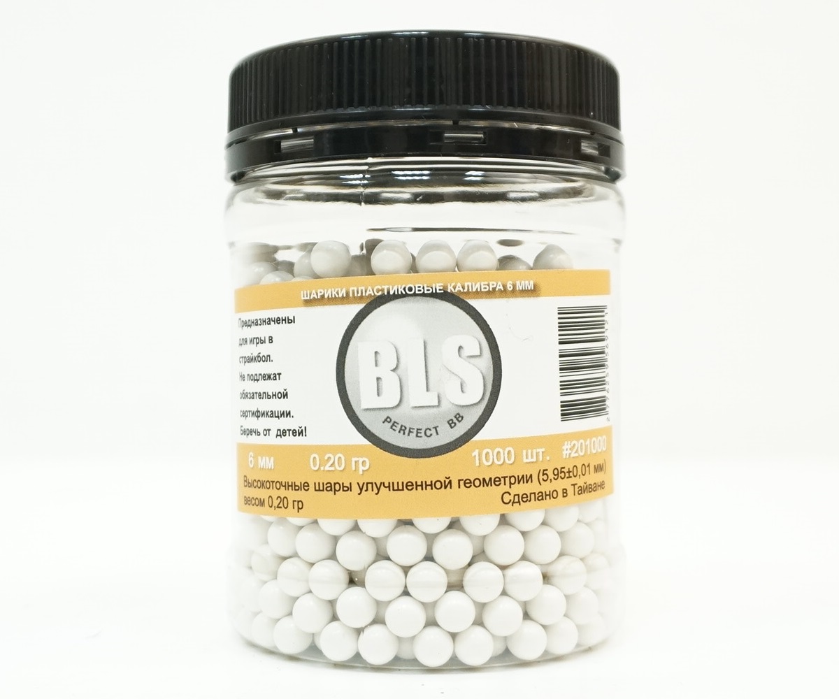 Пластиковые шарики калибром 6 мм BLS весом 0,20 грамм предназначены для стрельбы из страйкбольных пистолетов и винтовок. Количество в баночке — 1000 штук. Диаметр 5,95 мм, погрешность в диаметре этих шариков составляет всего 0,01 мм.