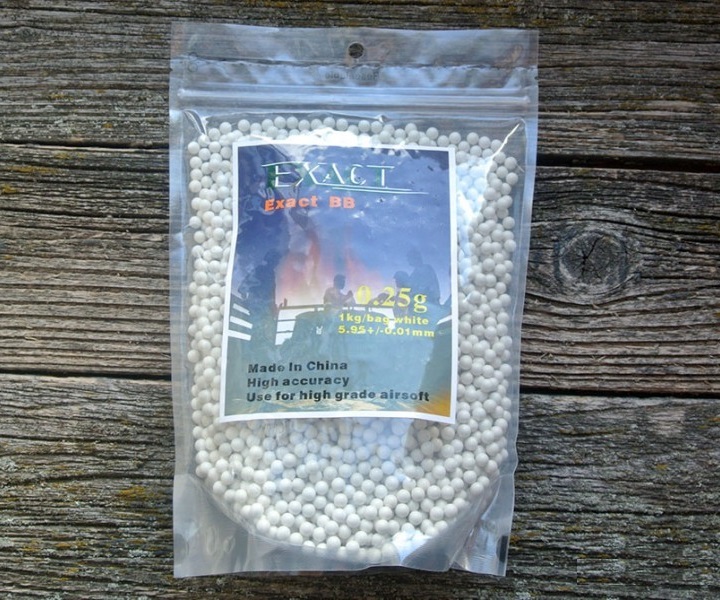 Пластиковые шарики калибром 6 мм Exact весом 0,25 граммов предназначены для стрельбы из страйкбольных пистолетов и винтовок. В упаковке примерно 4000 штук, 1 килограмм. Диаметр 5,95 мм, погрешность в диаметре этих шариков составляет всего 0,01 мм.