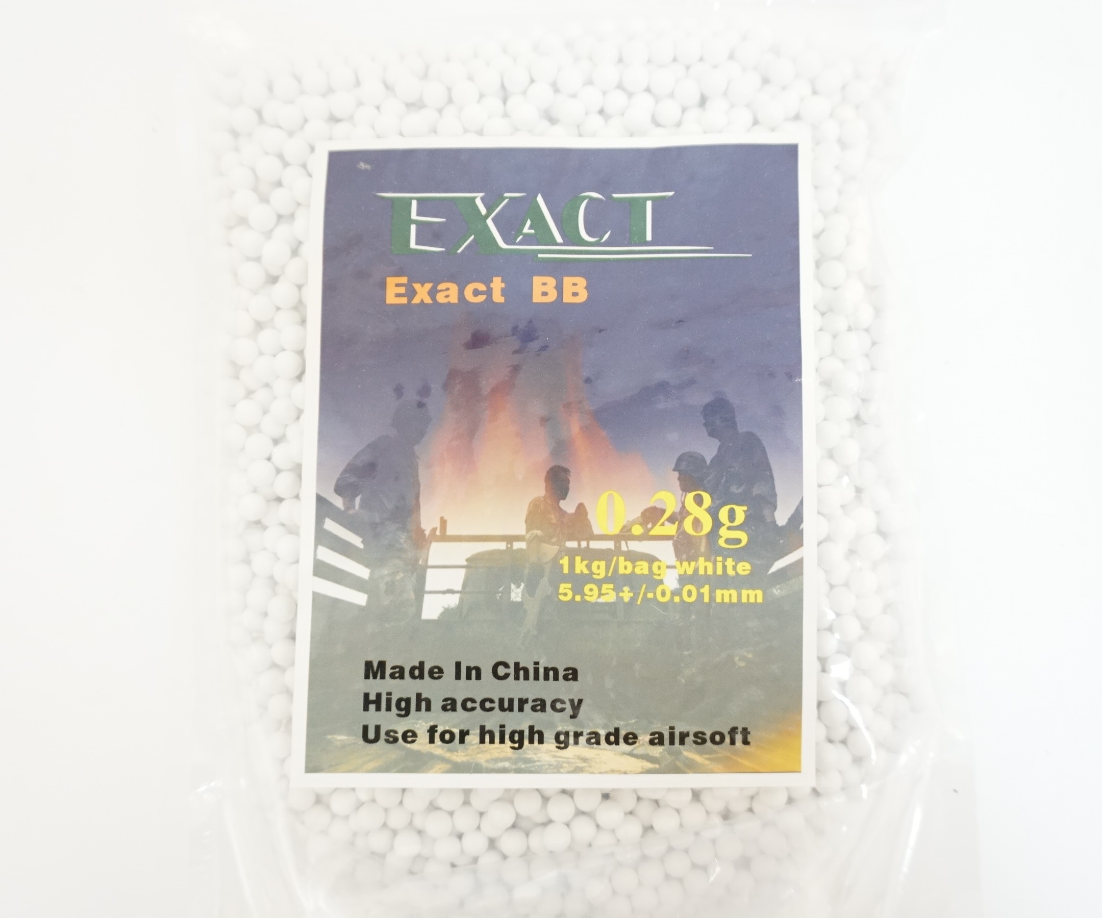 Пластиковые шарики калибром 6 мм Exact весом 0,28 граммов предназначены для стрельбы из страйкбольных пистолетов и винтовок. В упаковке примерно 3500 штук, 1 килограмм. Диаметр 5,95 мм, погрешность в диаметре этих шариков составляет всего 0,01 мм.