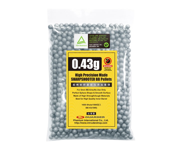 Шары Guarder BBs калибра 6 мм, черного цвета, с массой 0,43 грамм отлично подходят для стрельбы из страйкбольных пистолетов и приводов. В упаковке примерно 1000 штук.