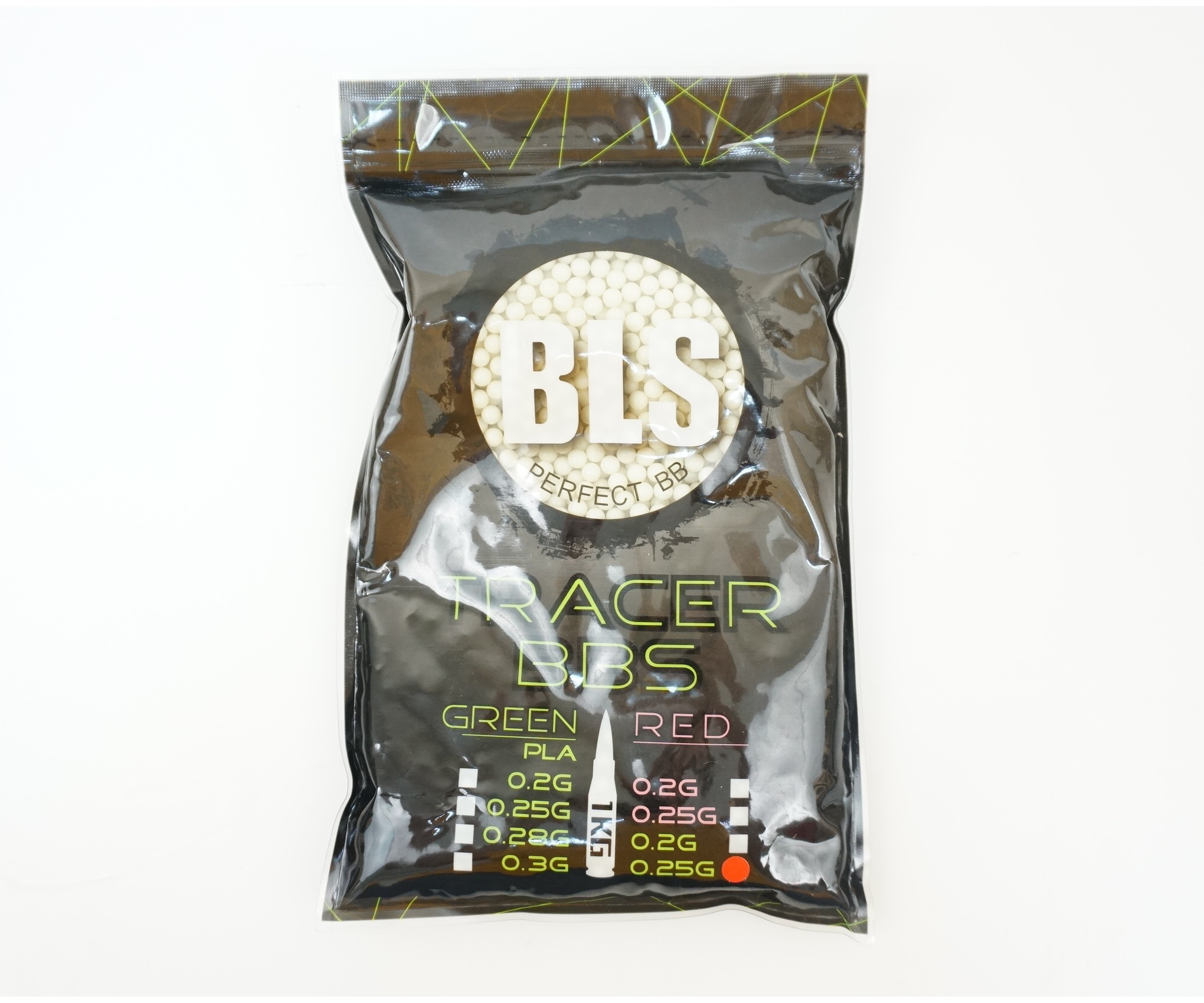 Пластиковые трассирующие шарики калибром 6 мм BLS Tracer весом 0,25 граммов предназначены для стрельбы из страйкбольных пистолетов и винтовок. В упаковке — 4000 штук, 1 килограмм. Диаметр 5,95 мм, погрешность в диаметре этих шариков составляет всего 0,01 мм.