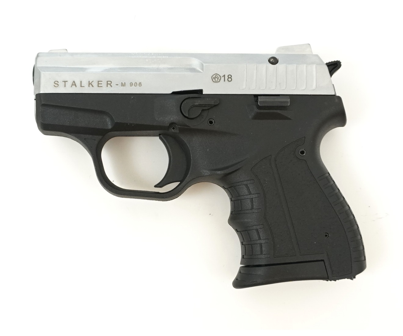 Шумовой пистолет Stalker M906 (хром) считается самым громким из сигнальных пистолетов. Эта модель довольно компактна, цельнометаллическая, только накладки рукоятки из пластика. Затвор в этом пистолете подвижный, а предохранитель двухпозиционный. Сигнальный Сталкер 906 прекрасно подходит для самообороны и для отпугивания животных. На этот пистолет можно надеть специальную насадку под ракетницу, чтобы запускать разноцветные фейерверки.