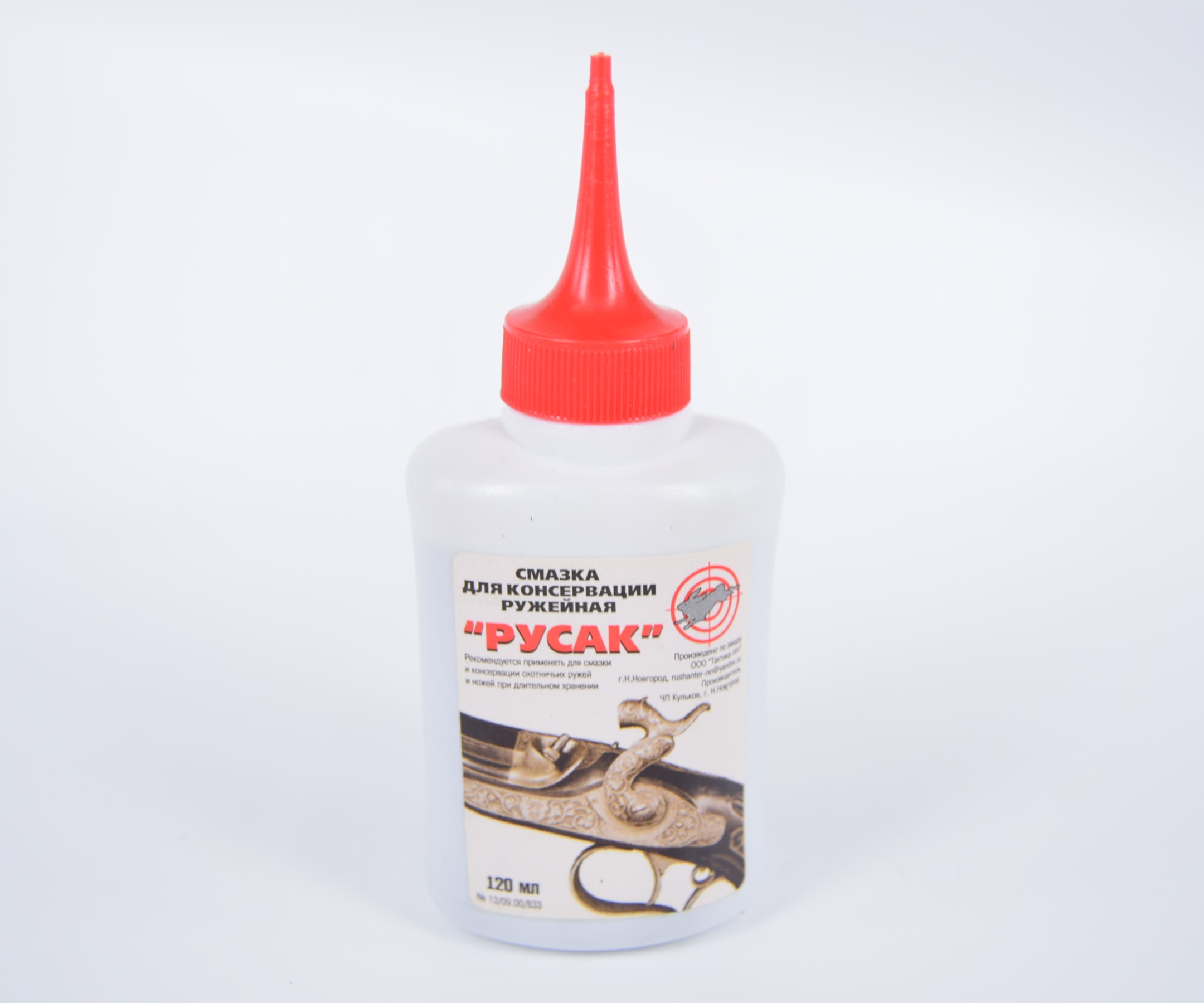 Смазка для консервации ружейная «Русак» используется для длительного хранения оружия, в периоды между сезонами. Смазка создает защитную пленку на металлических поверхностях. Обладает высокой вязкостью и не стекает с обработанных поверхностей. Упаковка – масленка, объем 120 мл.