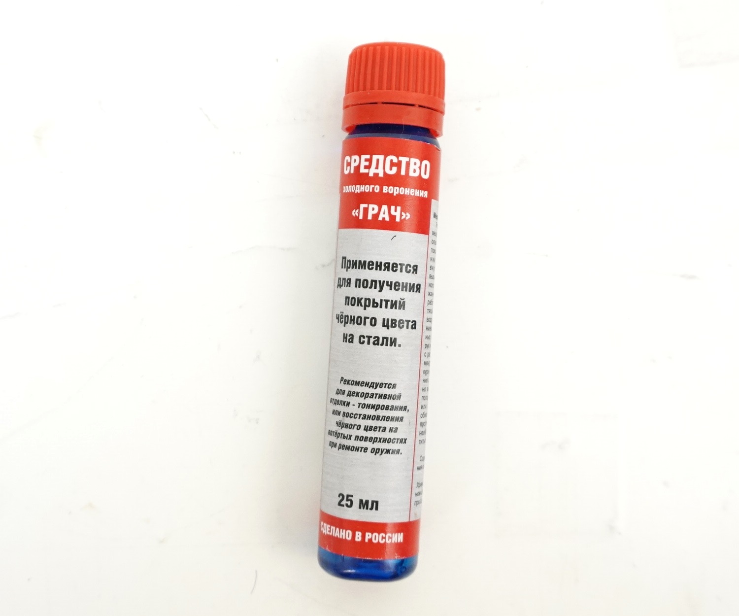 Средство холодного воронения «Грач» 25 мл применяется для получения покрытий черного цвета на стали, серебре, меди, никеле и их сплавах при комнатных температурах.