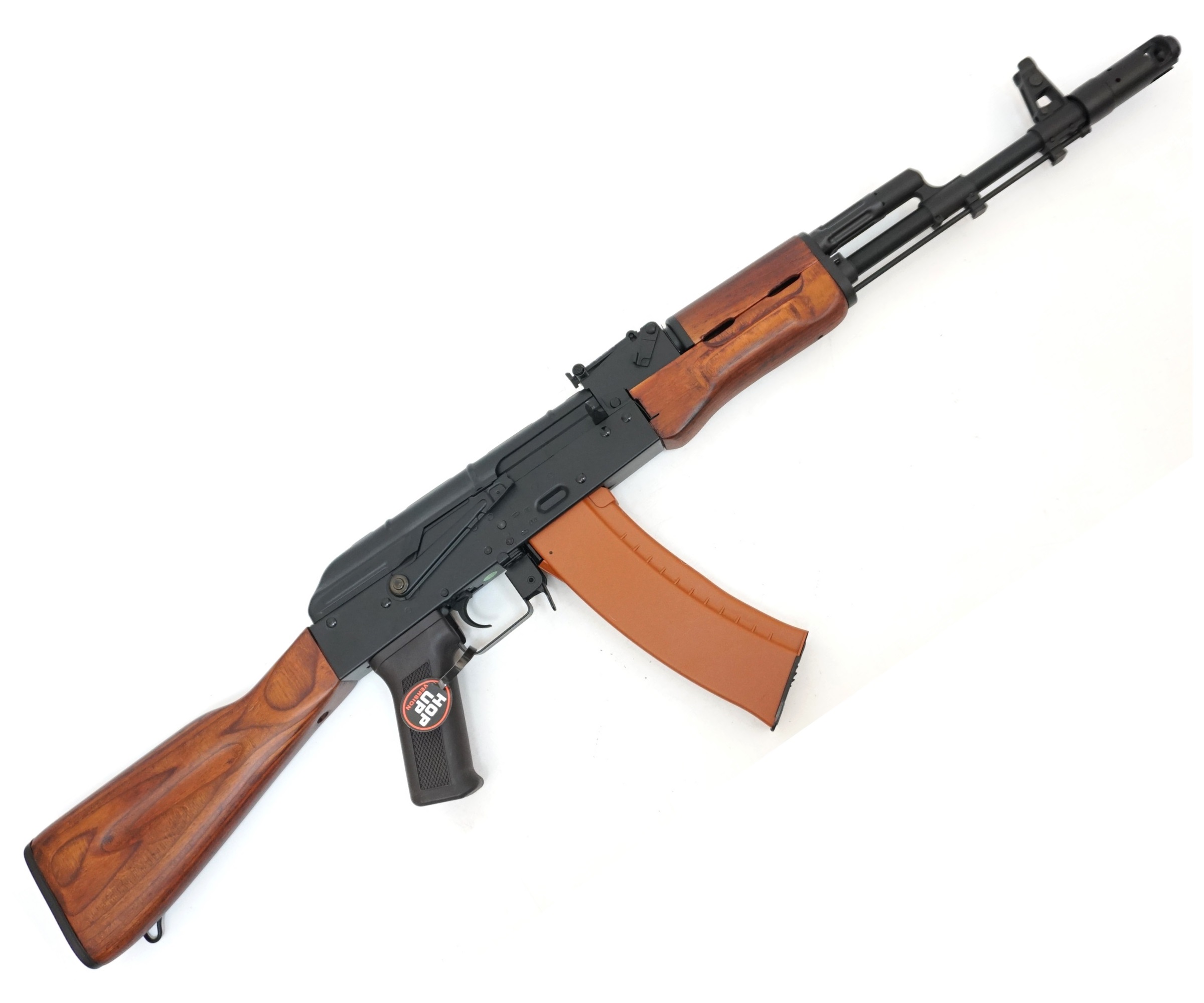 Страйкбольный автомат Cyma АК-74, дерево (CM048) – это реплика знаменитого «Калашникова» АК-74, привод высокого качества сборки, практически полностью изготовленный из металла. Изделие имеет базовый гирбокс 3-го поколения, и показывает скорость вылета в 130 м/с, что является максимальной для игр в зданиях. За кучность стрельбы отвечает настраиваемая камера хоп-ап. Боеприпасы – шарики 0,2 г, которые могут быть заменены на более тяжелые.