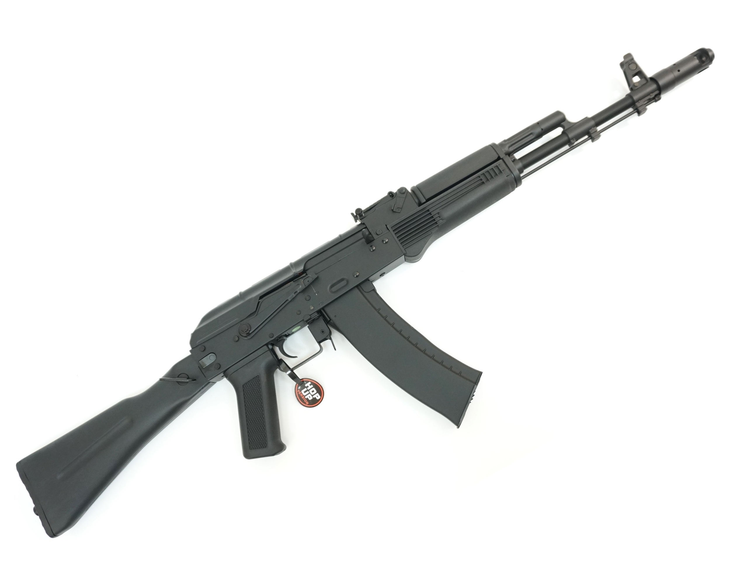 Приклад, цевье и пистолетная рукоятка выполнены из пластика. Изделие отличается хорошей подгонкой деталей между собой и практически полным отсутствием люфтов. Вес автомата приближен к весу боевого оригинала, и составляет 3,2 кг. Длина с разложенным прикладом – 94,5 см. Комплект привода включает шарики, магазин, аккумулятор с зарядным устройством, шомпол и инструкцию.