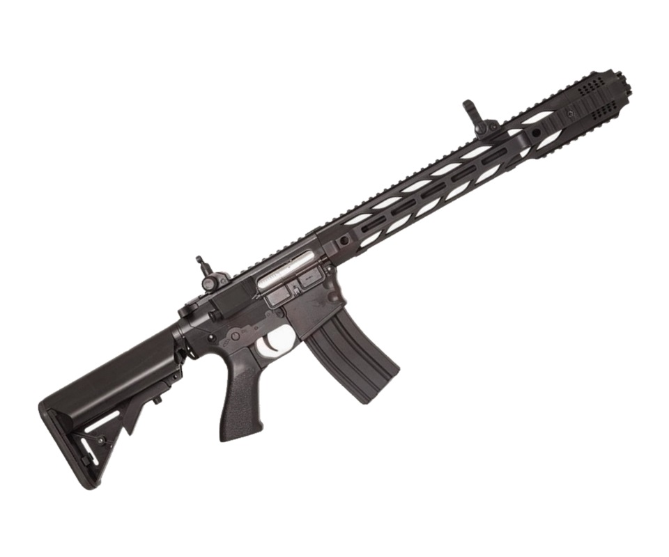Страйкбольный автомат Cyma M4 Salient Arms (CM.518BK) – это электропневматическая версия американского карабина с цевьем оригинальной конструкции. Специалисты Цима дополнили точную копию автомата М4 длинным цевьем от бренда Salient Arms. Мотор автомата работает от аккумулятора, находящегося в отсеке приклада, с разъемом мини-Тамия.