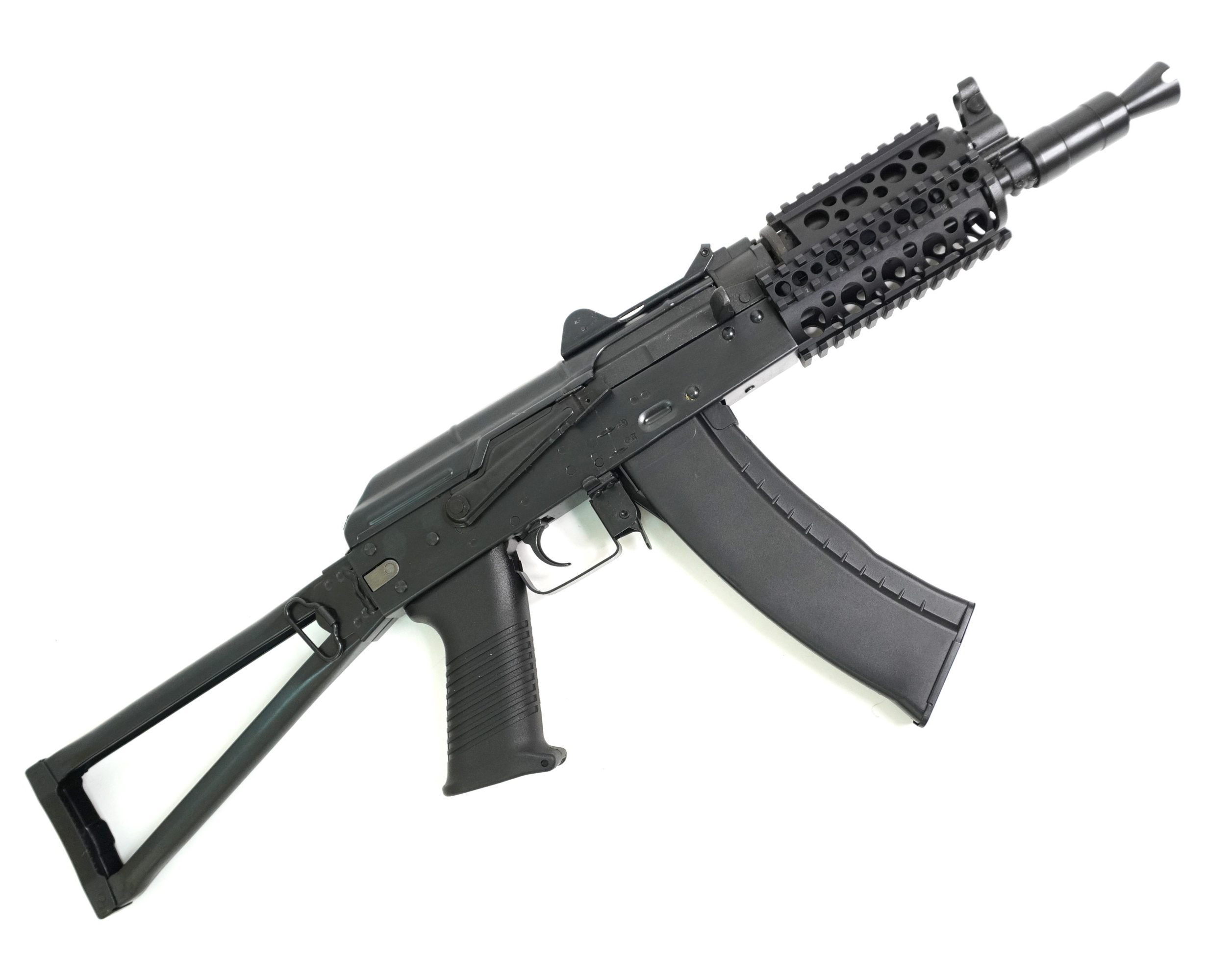 Страйкбольный автомат E&L АКС-74У Gen.2, RIS цевье (EL- A104-B) — это мобильный высококачественный привод от известной азиатской компании, отличающийся высокой степенью копийности. Автомат создан как точная копия знаменитого огнестрельного прототипа, и внешне мало отличается от оригинала. Функционирует автомат с рис-цевьем от аккумулятора, он размещается в специальном отсеке ствольной коробки.