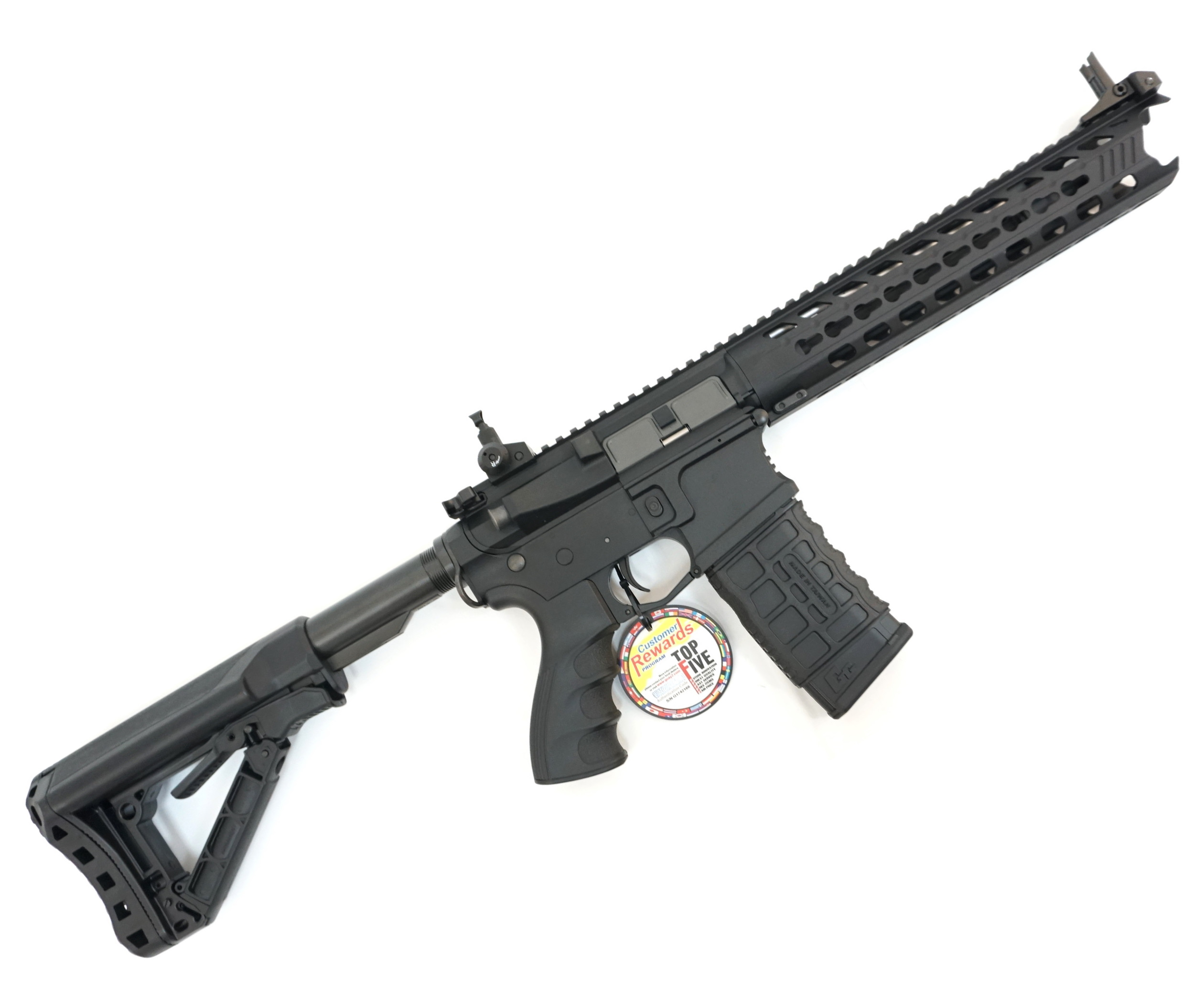 Модель отличается наличием ETU – электронного спуска, позволяющего гарантировать мгновенный отклик при нажатии на спусковой крючок, и MOSFET – электронного ключа, позволяющего установить режим отстреливания по три снаряда за раз. Боеприпасы для автомата – стандартные шестимиллиметровые шарики.