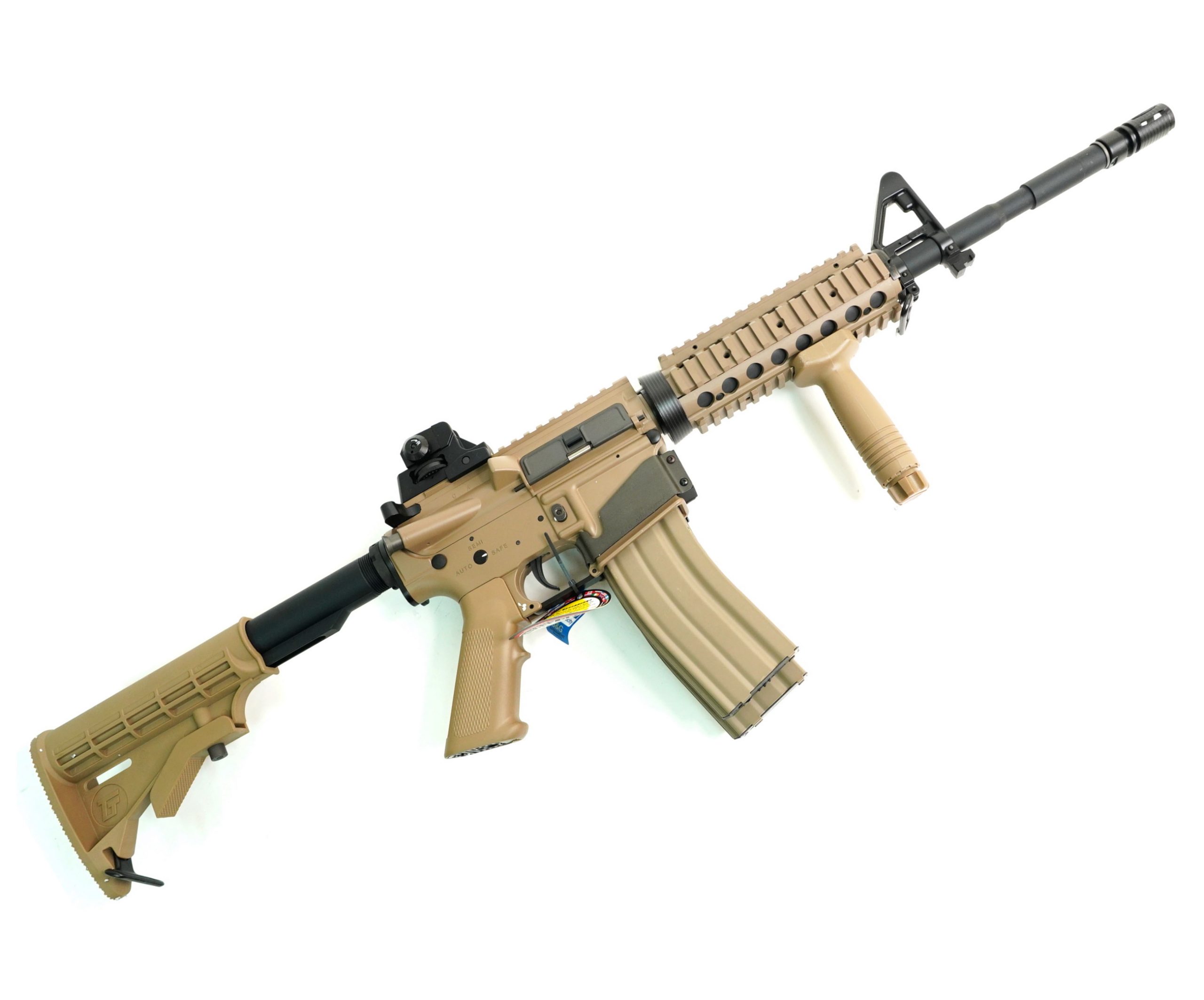 Страйкбольный автомат G&G TR16 R4 Carbine Desert (M4A1) TGR-016-R4C-DBB-NCM – это реалистичная AEG-версия карабина Кольт М4А1, разработка известного бренда пневматического вооружения. Модель отличается наличием телескопического приклада и реализацией функции блоубэк для повышения реалистичности стрельбы. Функционирует привод от аккумулятора в фальш-патроне, он не входит в комплектацию этого привода.