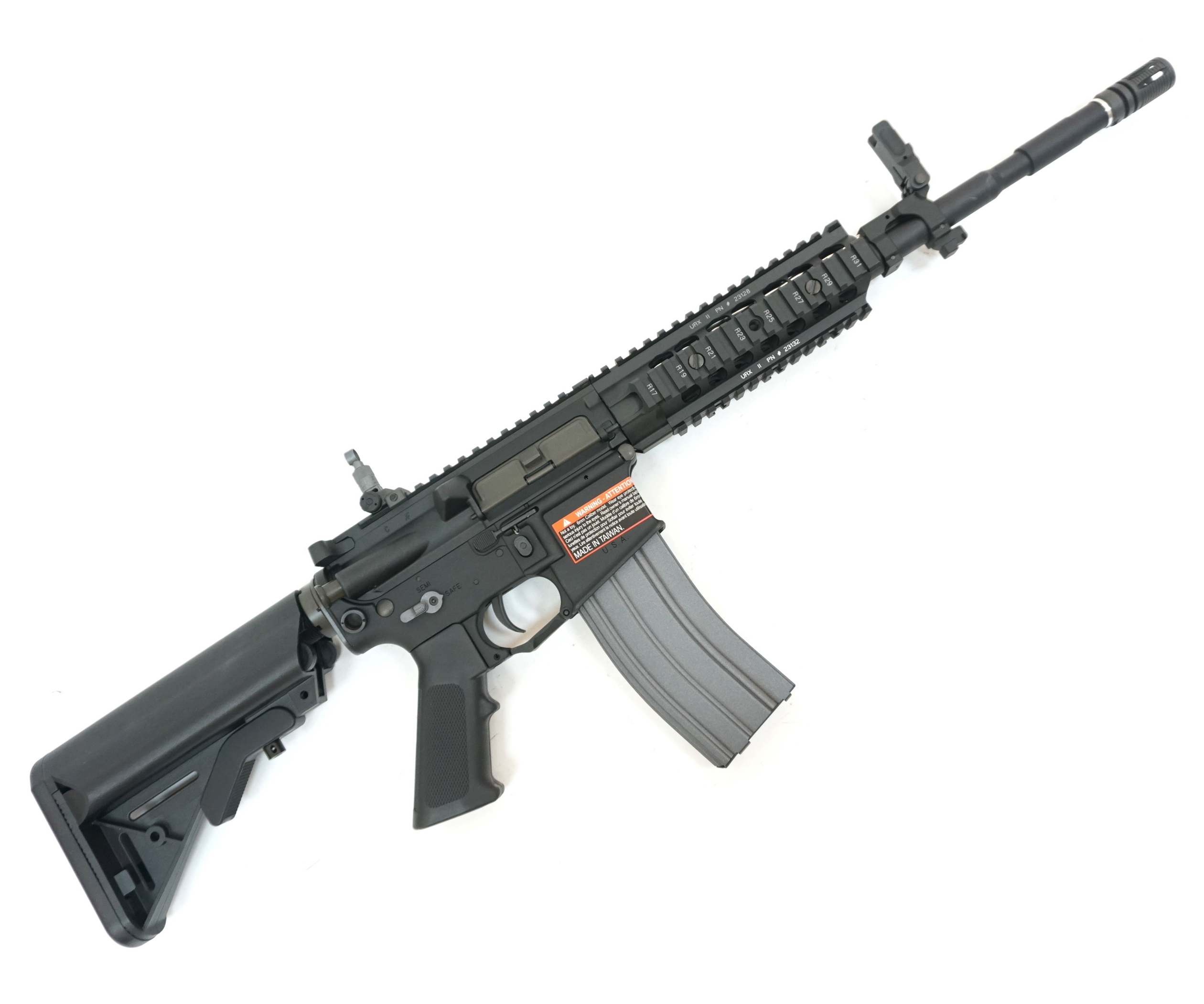 Ствол, цевье, ресиверы, труба приклада выполнены из сплава алюминия. Приклад и рукоятка пистолетного типа – из надежного ударопрочного пластика. На привод установлена реплика Key Mode цевья с ячейками интерфейса для дополнительного обвеса – например, фонаря, тактической рукоятки или ЛЦУ.