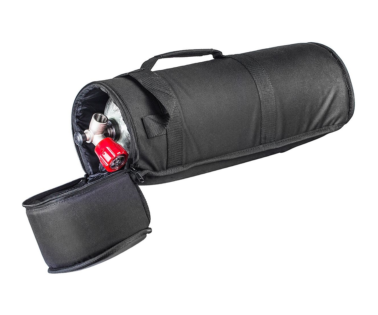 Жесткий чехол предназначен для баллона высокого давления объёмом 6-7 литров, изготовлен из нейлона. С карманом, цвет — черный.